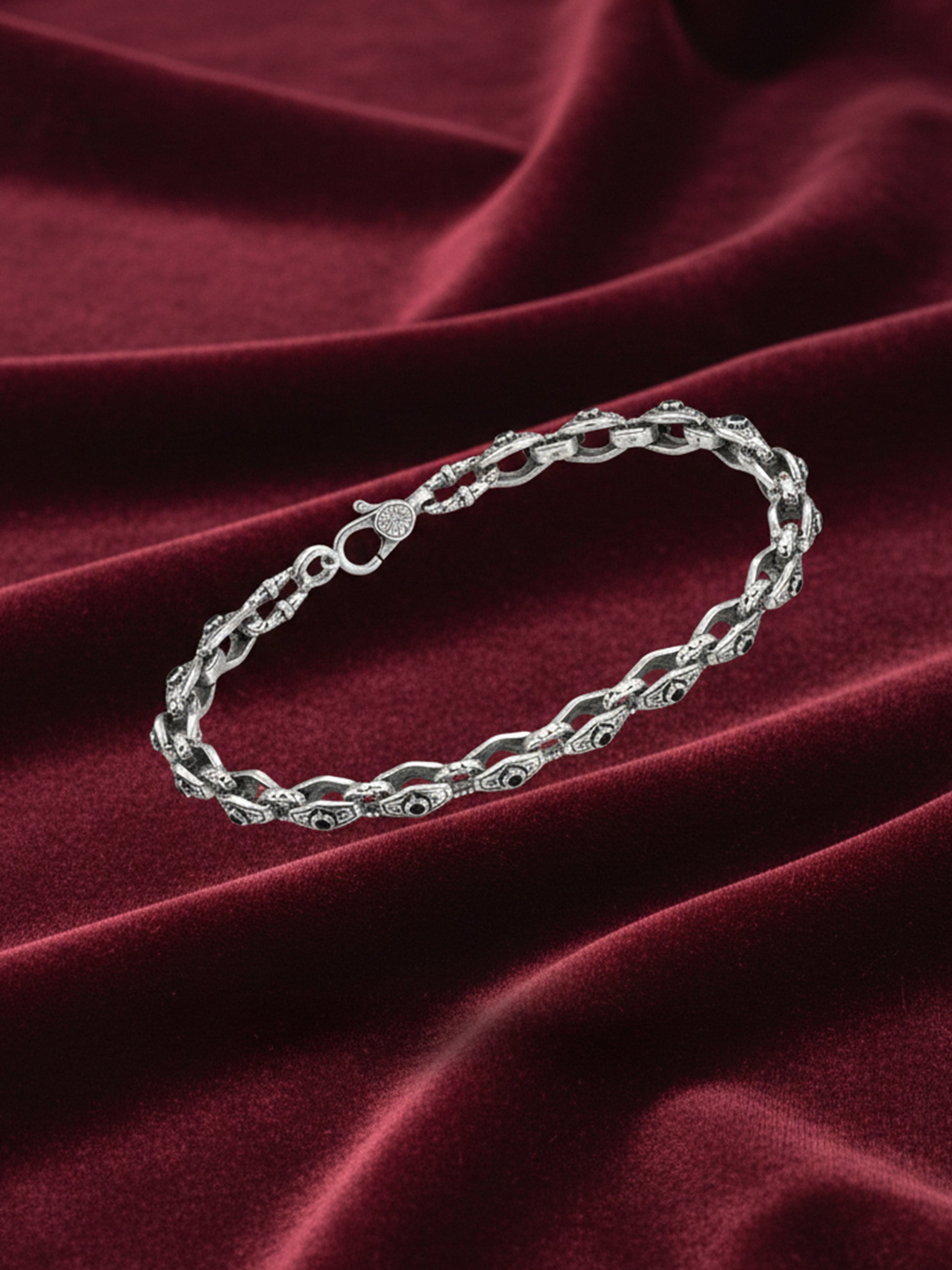 Upgrade your everyday style with this premium 925 Sterling Silver Bracelet for Men, crafted for those who appreciate bold and contemporary jewellery. Designed with strong interlocking chain links, this stylish silver bracelet offers durability, comfort, and a modern masculine look.Made from genuine 925 sterling silver, the bracelet features a smooth polished finish and a secure clasp for all-day confidence. Its versatile design makes it perfect for daily wear, office wear, casual outings, and party occasions. The solid construction ensures long-lasting shine while maintaining a lightweight and comfortable feel. Designed in classic chain patterns such as curb, rope, and box link styles, this silver chain bracelet adds a refined touch to any outfit. It also makes an ideal gift for men on birthdays, anniversaries, festivals, and special occasions.